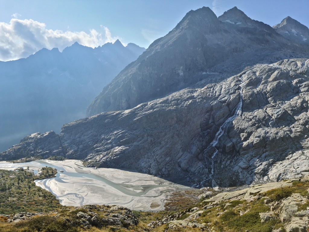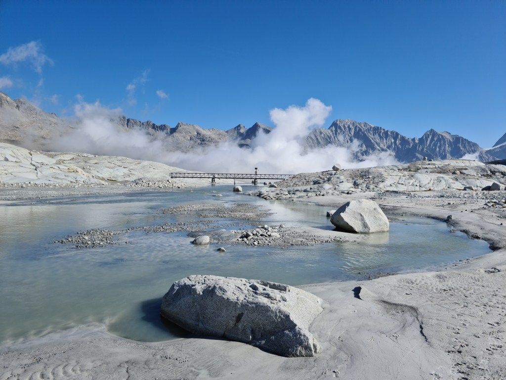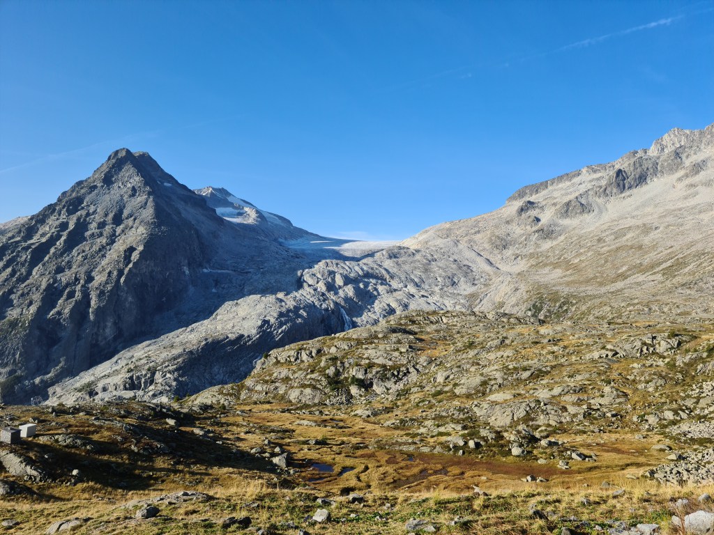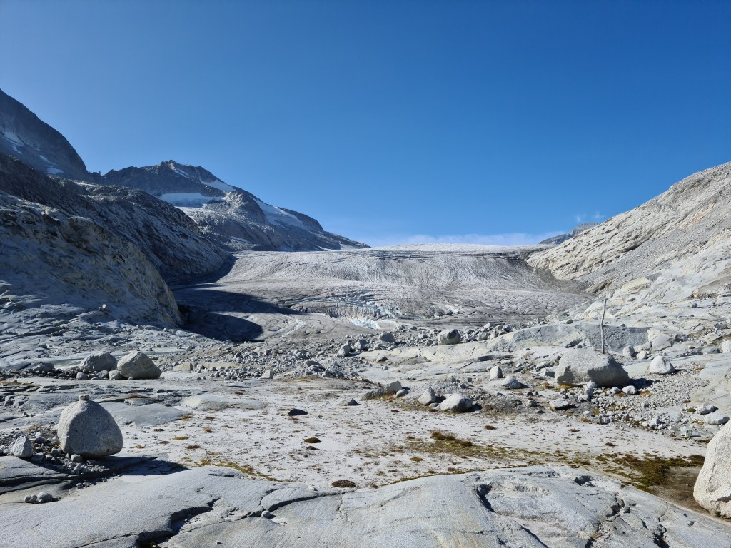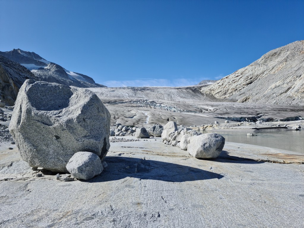 Alle 10:10 arrivo alla base del ghiacciaio. Qui il terreno cambia: compaiono morene, ghiaie chiare e piccoli laghetti formati dall’acqua di fusione.