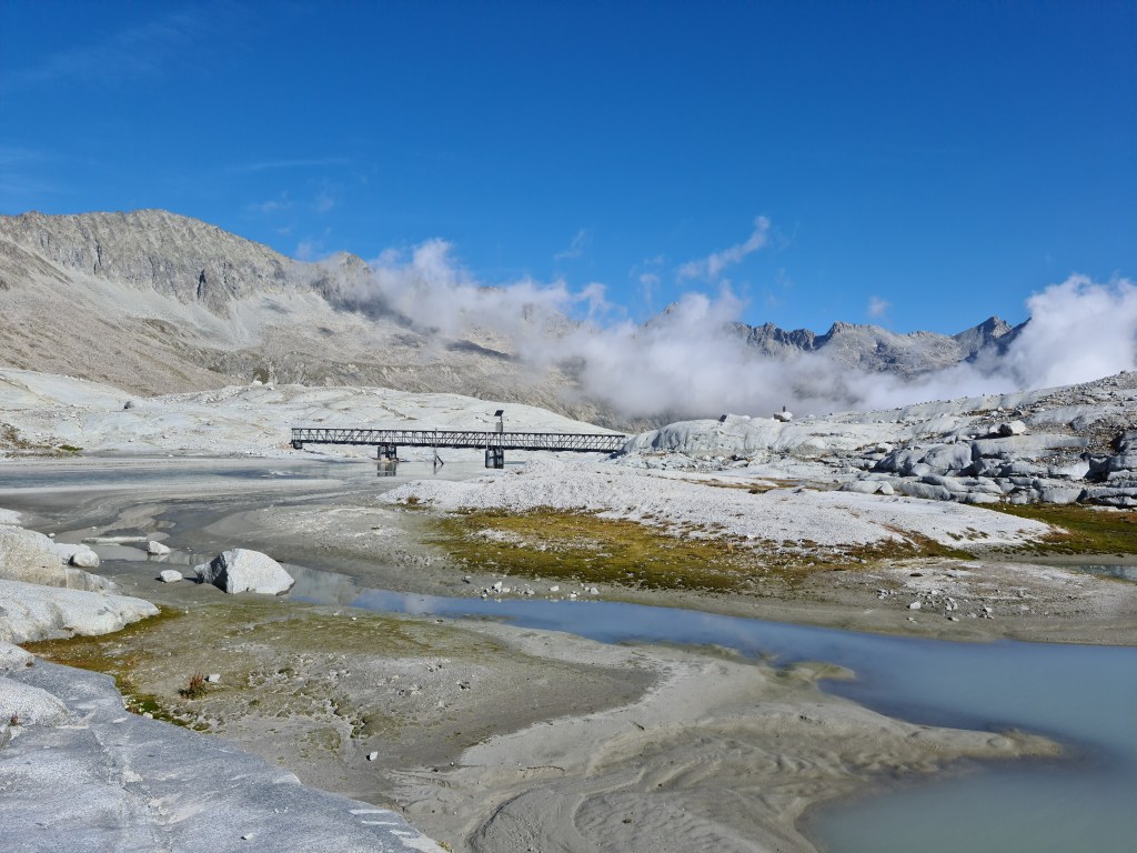 Tra i canali d’acqua che scorrono tra le morene, una passerella metallica permette di attraversare e raggiungere l’altra parte della conca.