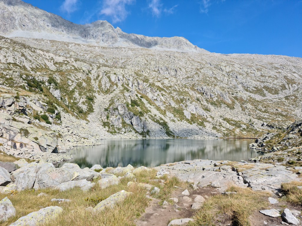 Poco prima del rifugio faccio una breve deviazione verso il Lago Mandrone (2403 m), incastonato tra rocce levigate e piccoli depositi morenici.