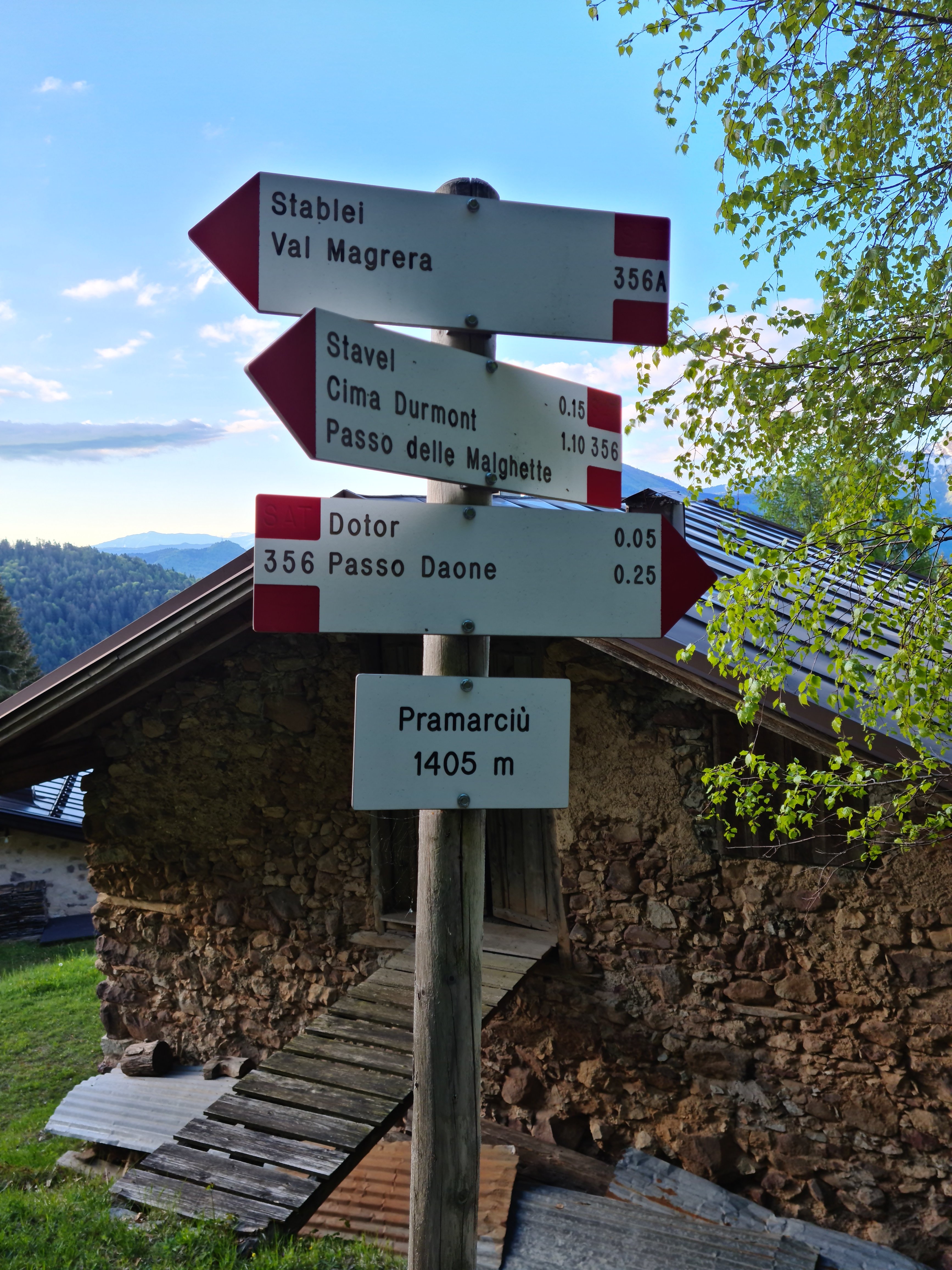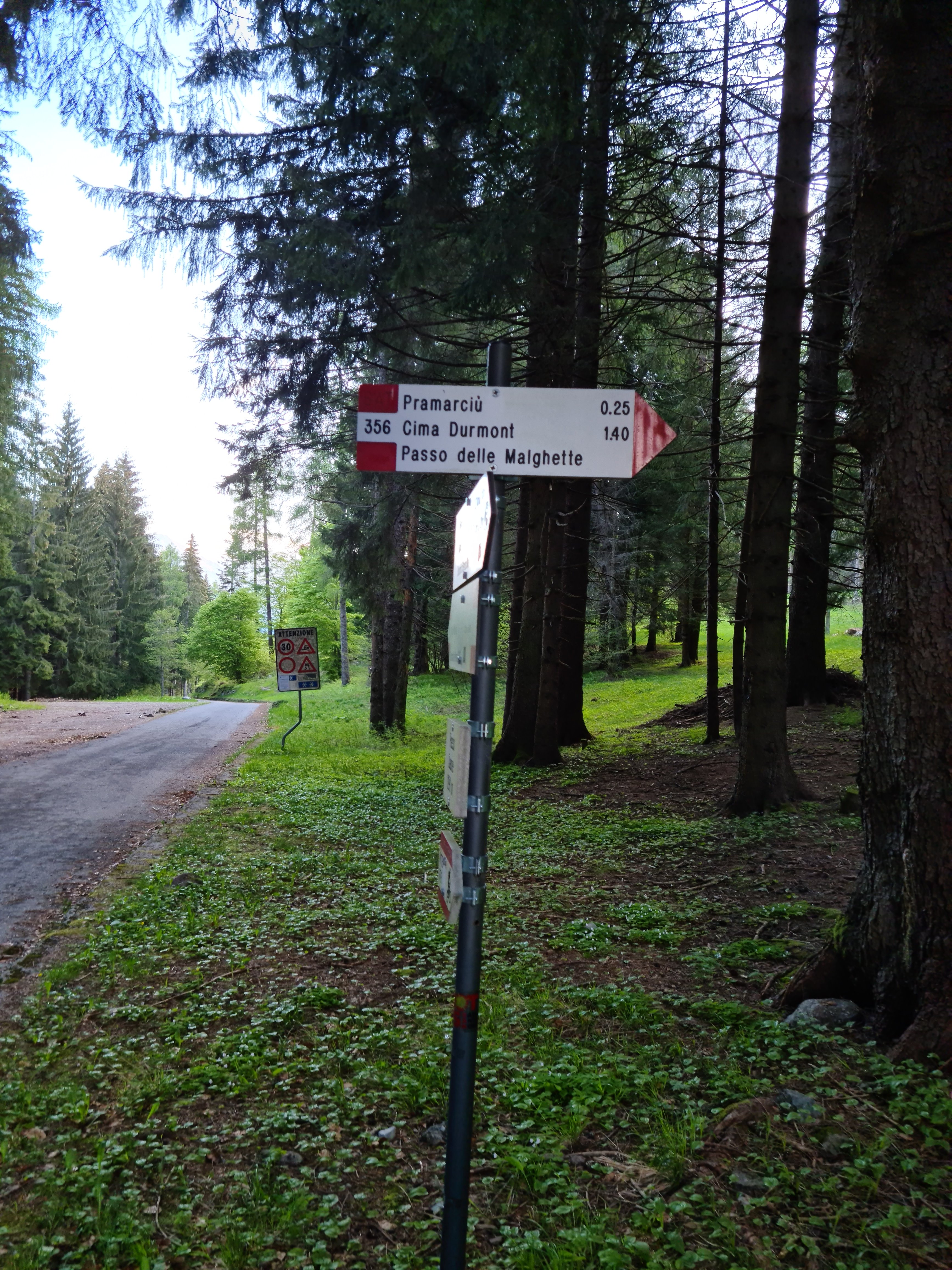 Dal Passo ho imboccato prima il sentiero nr. 350 e, poco dopo, il 356A che mi ha riportato a Pramarciù. Volendo si può abbreviare il ritorno col 356B, che collega al Passo Campiol, e fare rientro passando nuovamente dal sentiero dell’andata e, quindi, da Cima Durmont.