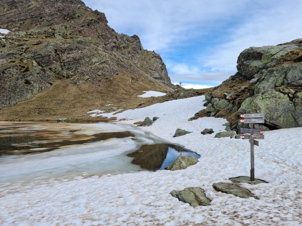 Una volta scesi da questo pezzo, abbiamo imboccato il sentiero sulla sinistra fino al meraviglioso Lago Luco ancora mezzo ghiacciato.