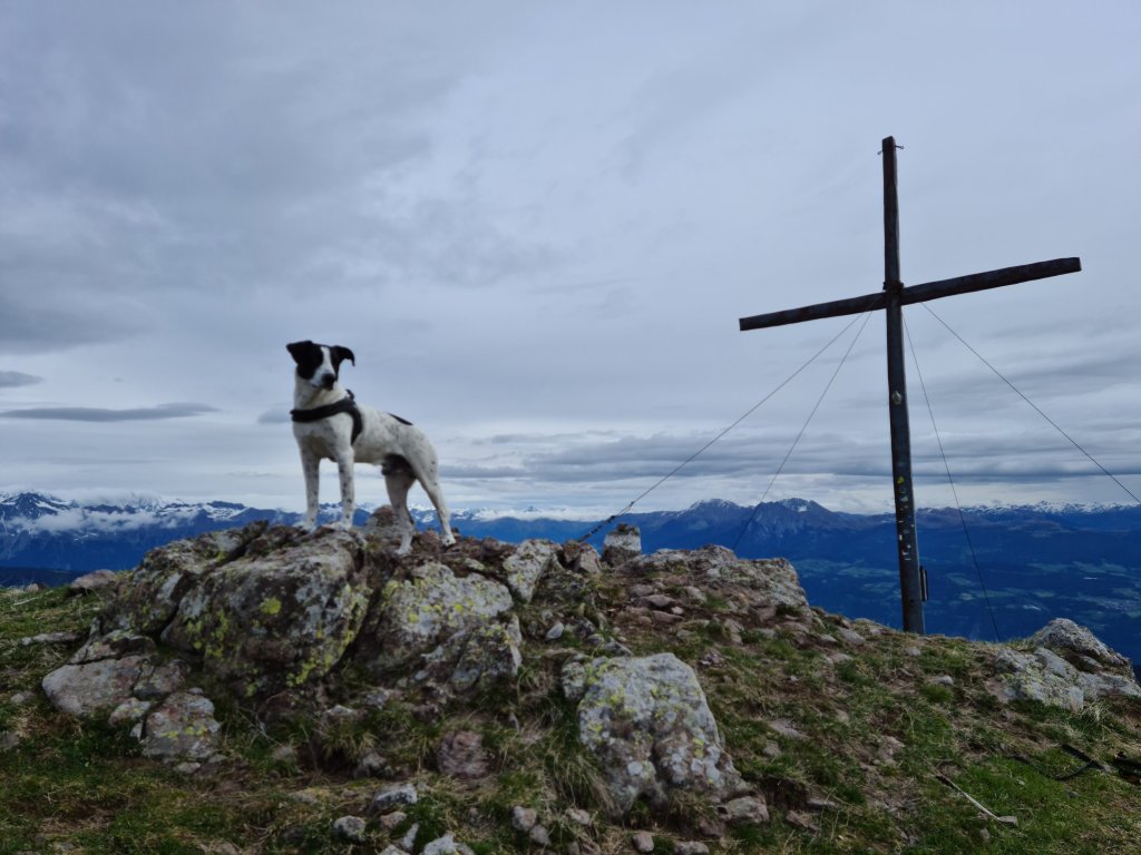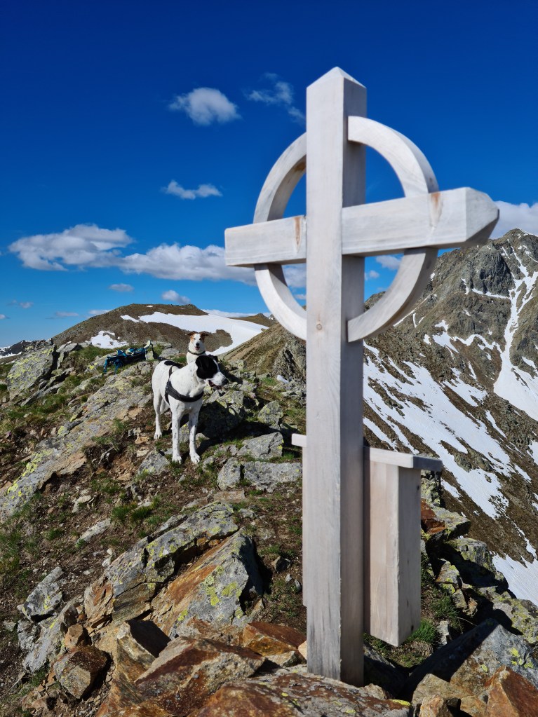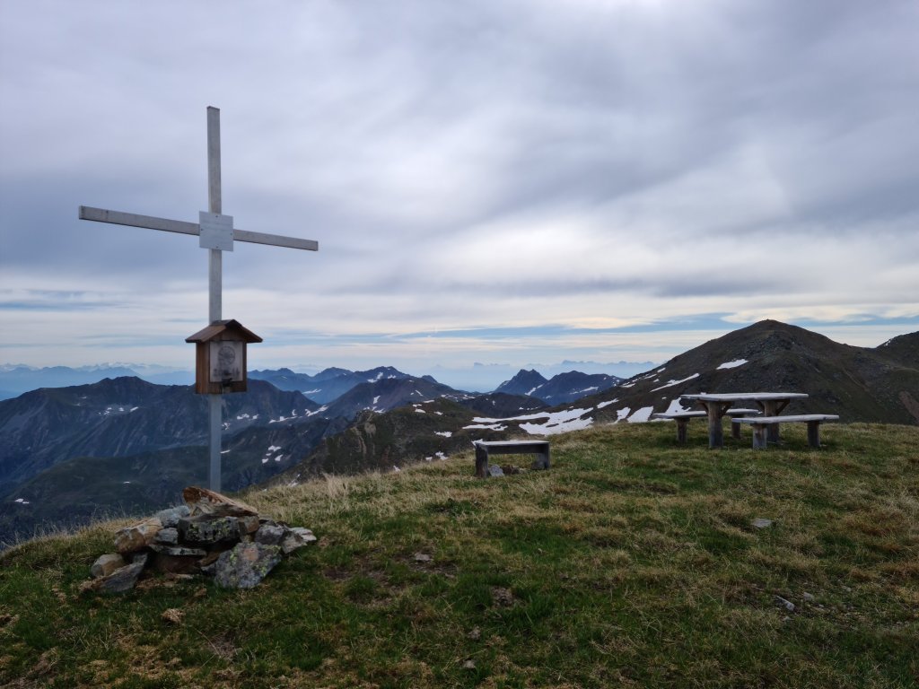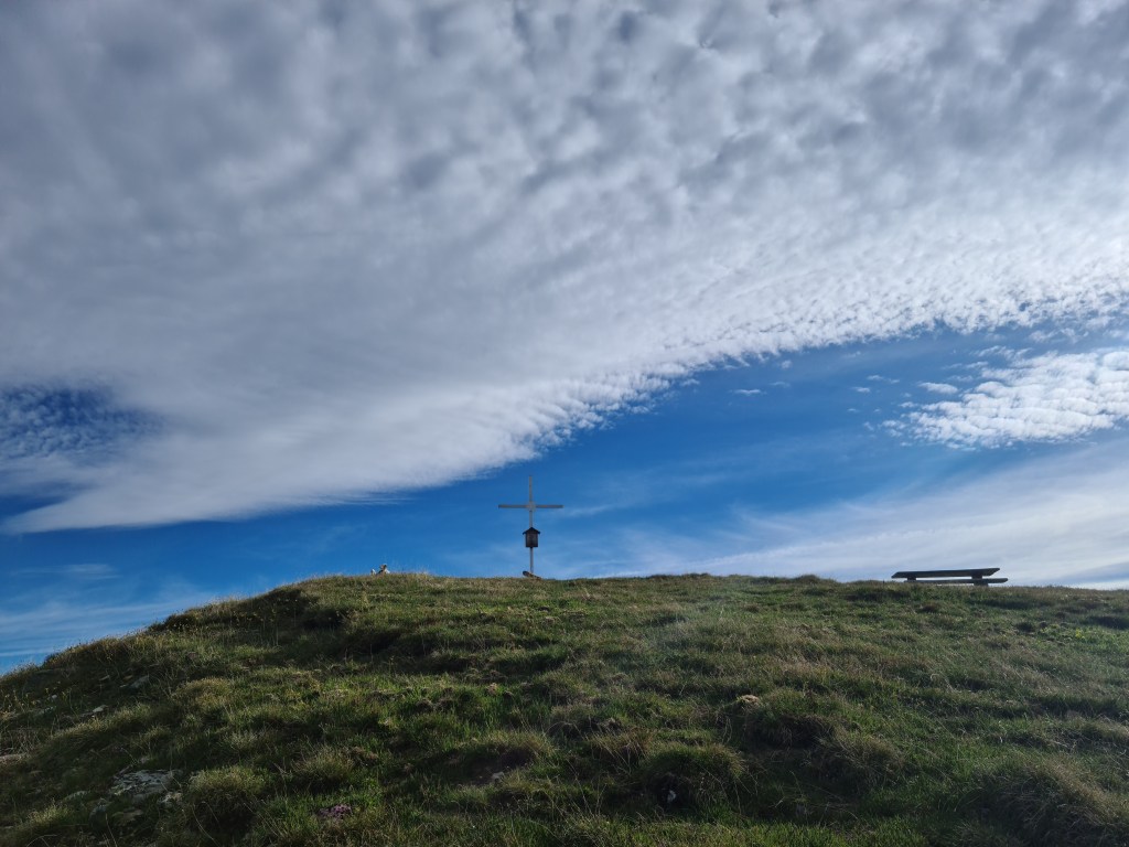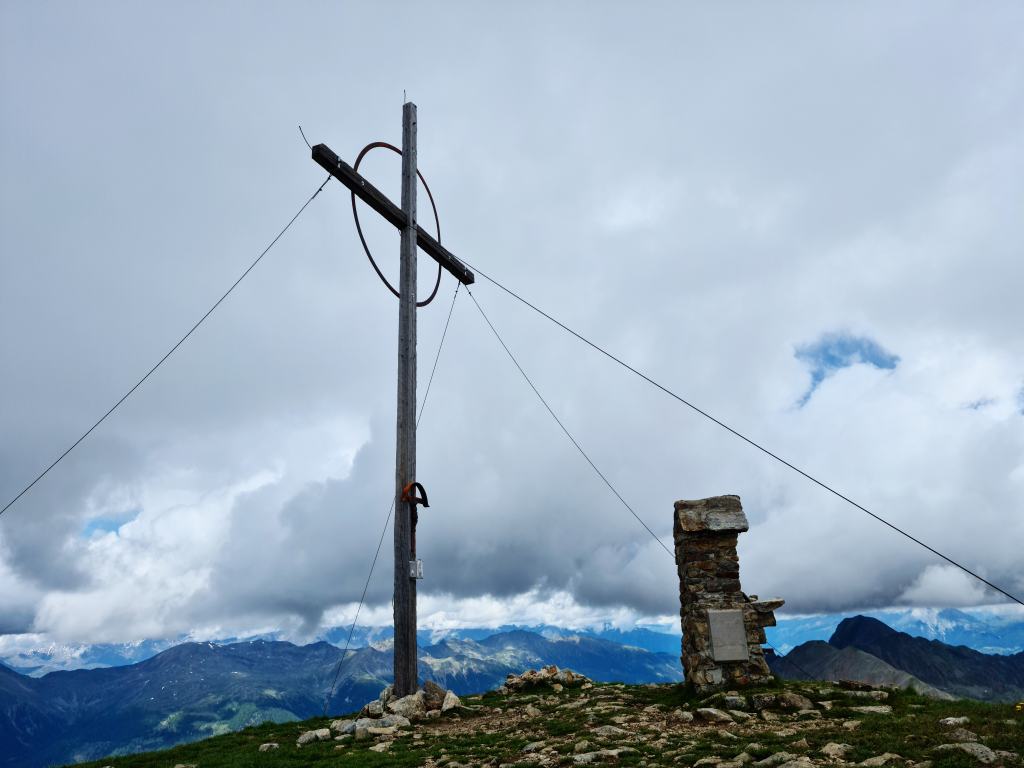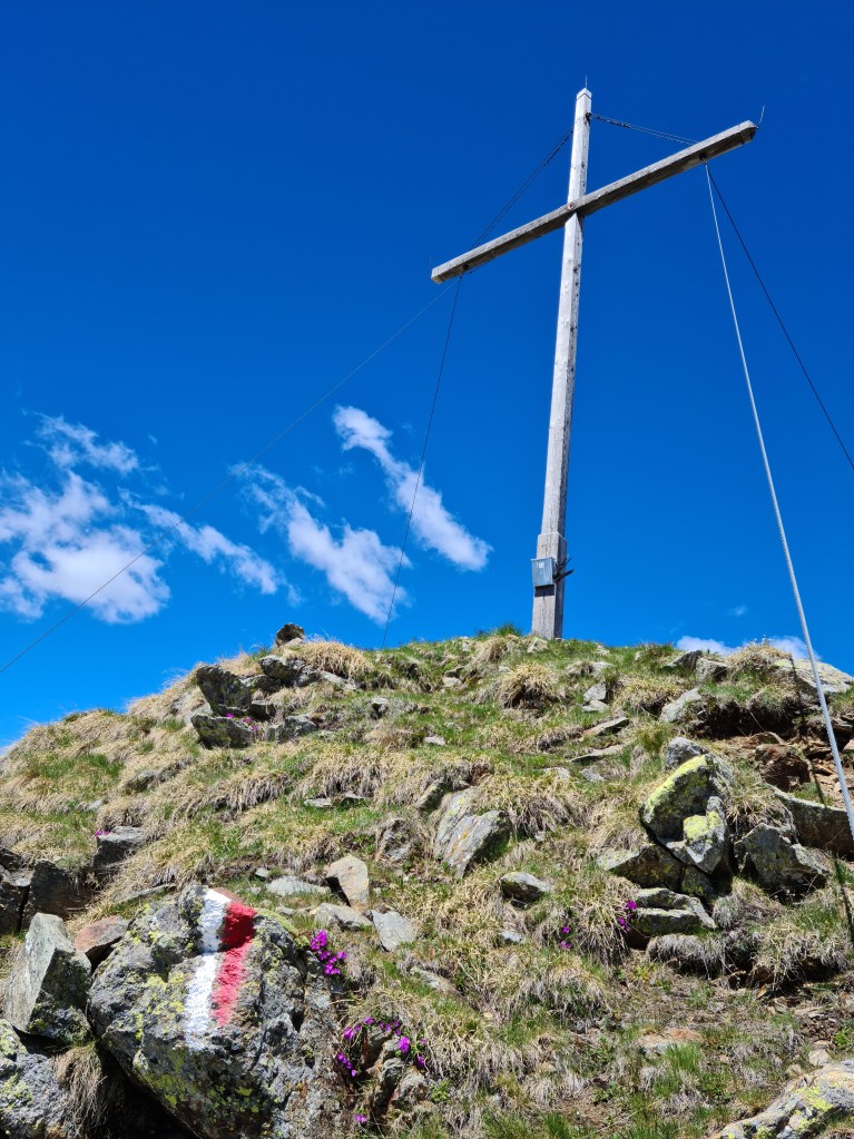 Alle 10:30 sono arrivata allo SamerJoch e ho deciso di proseguire, in una sorta di anello, sul 133-19. Si stava benissimo, era calato il vento e c’era una giornata magnifica. Insomma, per farvela breve mi sono detta: sai che c’è? Che proviamo a salire anche sul Monte Ometto (ignara di tutta la strada che poi avrei dovuto fare per tornare alla macchina). Alle 11:40, abbiamo toccato la croce del Monte Ometto (mt. 2395). Che spettacolo! Che vista strepitosa che c’è!