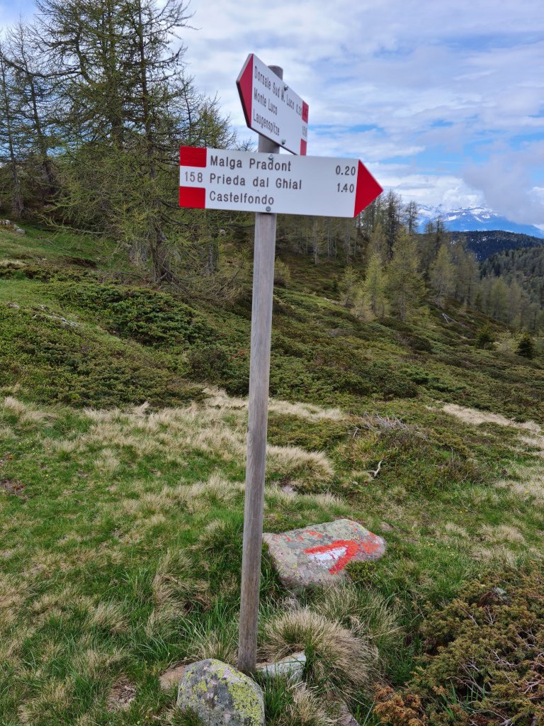 Verso le 10 sono scesa, ho oltrepassato il lago, e sono tornata all’incrocio, dove ho ripreso il 133, che ho abbandonato dopo poco meno di 40 minuti, per imboccare il 10A in direzione della Malga Monte Luco. Anche in questo caso, la Tabacco online non lo segna, ma, dopo 10 minuti di discesa, si trova sulla destra il sentiero nr. 158 che porta alla Malga Pradont (mt. 1905).