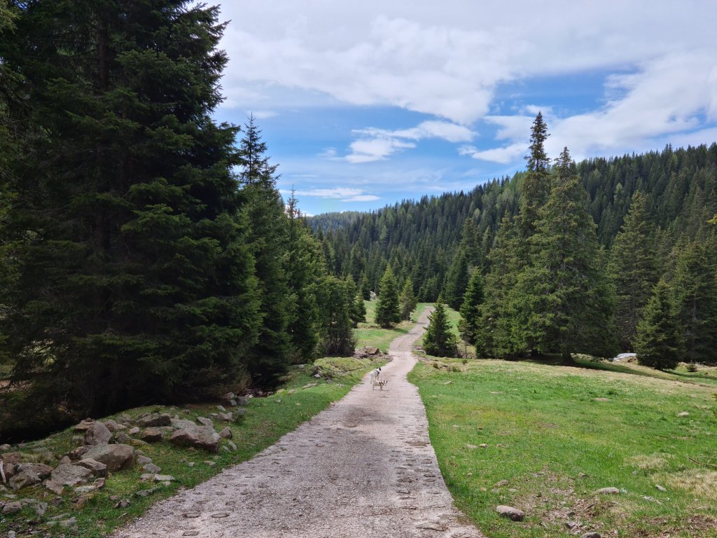 Invece, una volta arrivata poco prima della Garbella, ho avuto una bella sorpresa: un sentiero con segnaletica (non segnato invece sulla cartina) che rimaneva alto e proseguiva in direzione nord. L’ho imboccato senza neppure pensarci e ho fatto benissimo: in mezz’ora mi ha riportata dritta dritta alla Malga Palù! Non vi dico la felicità!