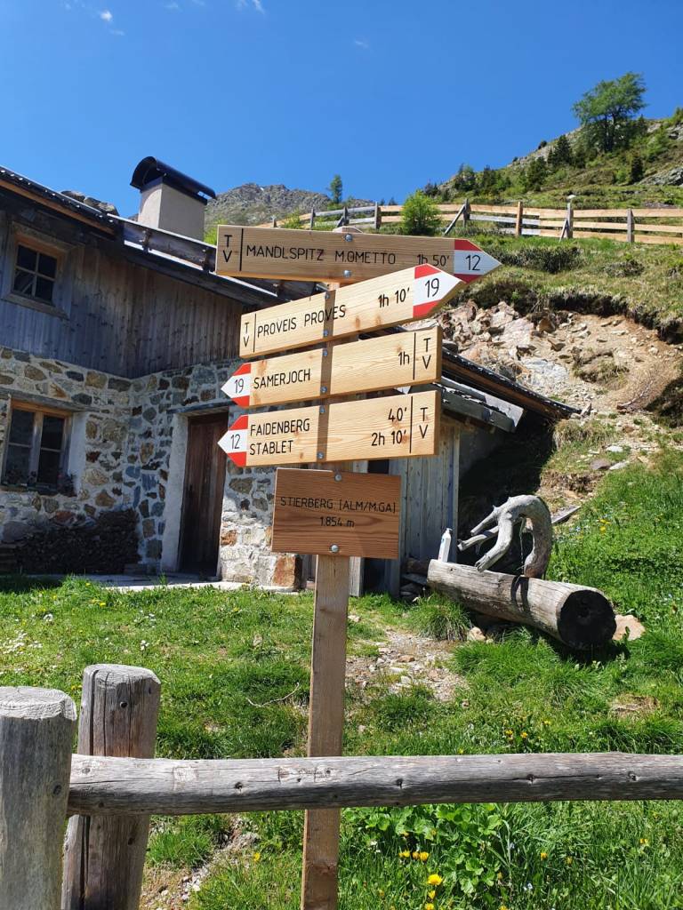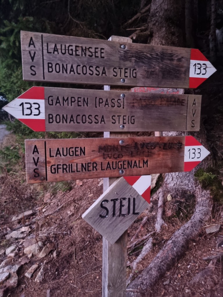 Sono partita dal Gampen Pass (dove ho parcheggiato) alle 6:40. Alla prima curva della sterrata che conduce alla Laugenalm, sulla destra si trovano le indicazioni per il sentiero 133 Bonacossa. Questo sentiero è il diretto, ma io oserei chiamarlo direttissimo. Praticamente un’ora e 40 di step ups al box senza interruzioni…