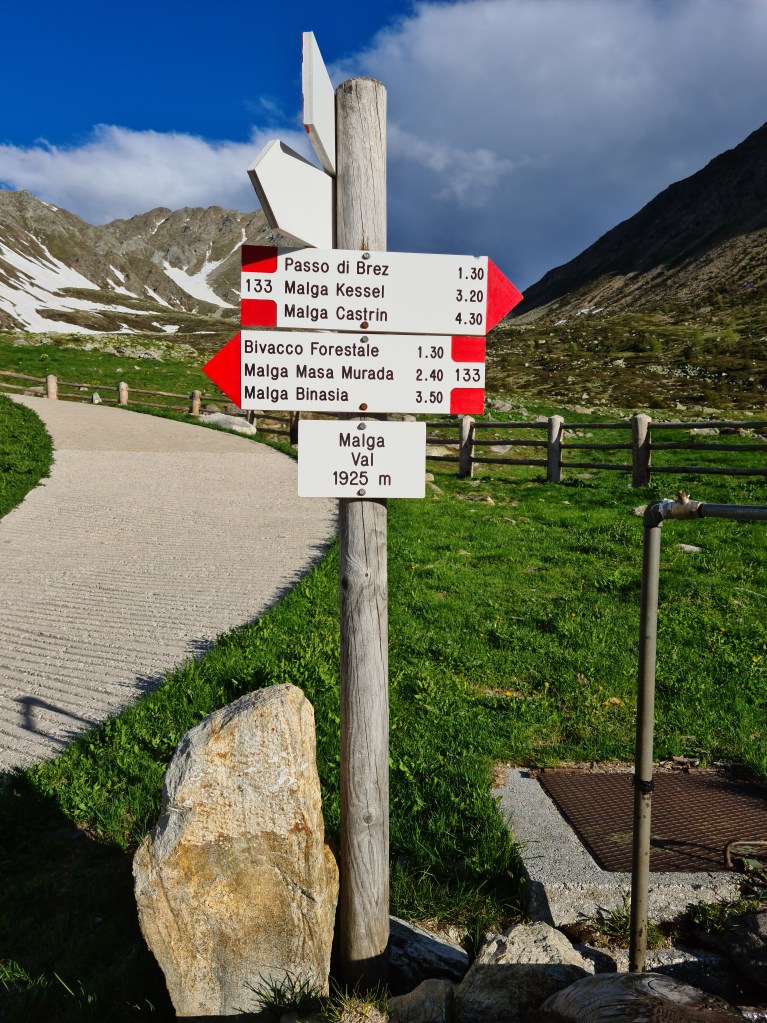 Ho parcheggiato dopo il primo tunnel (venendo dalla Val di Non) al Passo Castrin e mi sono incamminata pochi minuti dopo le 6. Nel giro di 20 minuti ho raggiunto Malga Castrin, da dove ho imboccato il famoso sentiero nr. 133 Aldo Bonacossa. Avevo fatto questo stesso percorso esattamente un anno prima, ma lo ricordavo perfettamente da quanto mi era piaciuto.