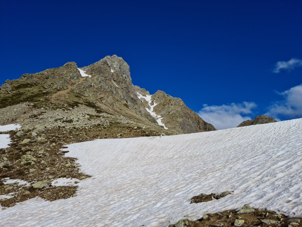 Fatte le foto di rito, abbiamo fatto ritorno al passo. Scendendo dalla cresta, di fronte si vedono la Schrummspitz (Cima della Siromba) e la Cima Binasia, invece sulla destra c’è il Lago della Siromba.
