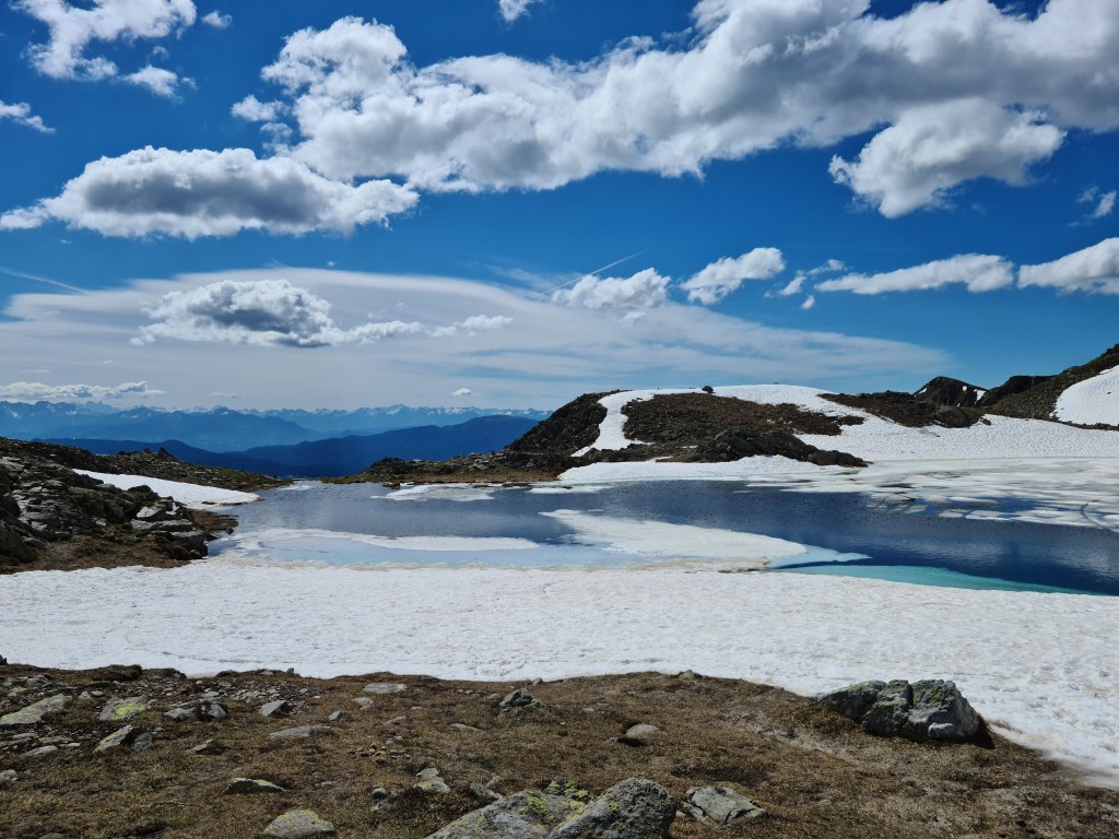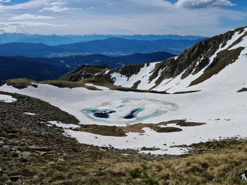 Sono poi scesa verso il Goldlahnsee (mt. 2294), che era ancora mezzo ghiacciato con dei colori spettacolari.