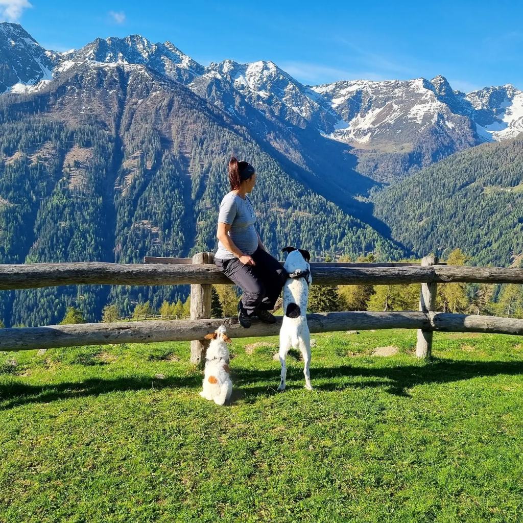 Oggi vivo in Val di Non, e qui è diverso. Non sono legata a una casa, ma al tipo di vita che respiro ogni giorno: al gesto semplice di aprire la finestra e vedere le Dolomiti di Brenta illuminate dal sole del mattino, all’aria fresca che porta l’odore dei prati bagnati, al passo dei miei cani accanto a me sui sentieri. Al silenzio che non è mai vuoto, perché è fatto di vento, di campane lontane, del riso di mia figlia che corre tra l’erba.